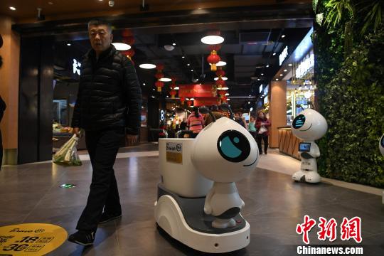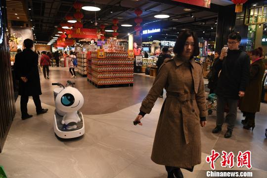 한 마트 직원이 로봇의 기능을 선보이고 있다.