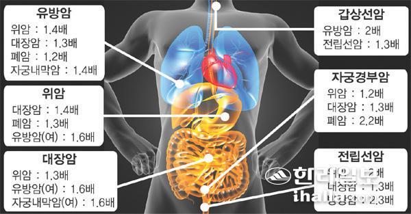 ▶위암=아시아 인구 집단 연구에서 대장, 유방, 전립선암, 폐암, 갑상선암 증가하므로 일반적 암검진 권고안에 따른 검진을 실시해야 한다.