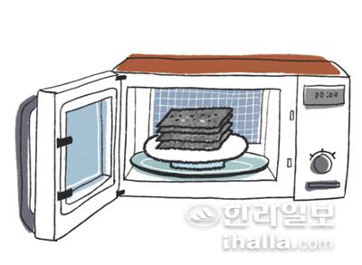 많은 양을 구매하는 경우가 많은 김은 밀봉을 잘 해서 냉장고나 냉동고에 보관하더라도 시간이 지나면 눅눅해지게 마련이다. 그럴 때는 눅눅해진 김 몇장을 접시에 담아 김의 상태에 따라 30초에서 2분정도 전자레인지에서 돌려주면 수분이 증발하면서 바삭해진다.