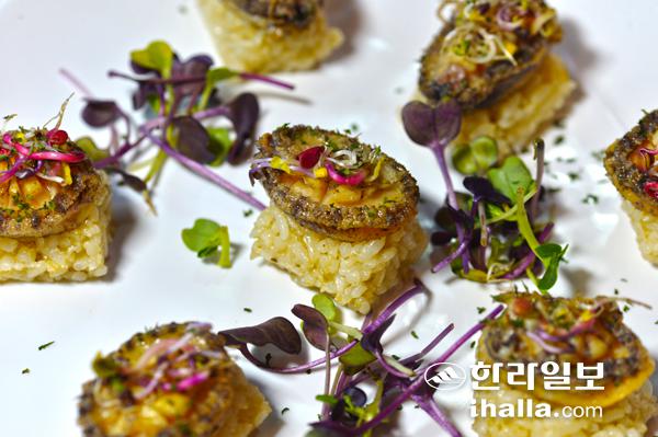 '전복한끼'가 먼저 나왔다. 이 메뉴는 전복내장으로 비벼진 밥을 초밥처럼 동글동글 말아 그 위에 다시 전복이 올린 것이다. 오쿠다에서만 맛볼 수 있는 메뉴라고 주인장은 귀띔한다. 곧바로 한 점을 집어 입안에 넣는다.