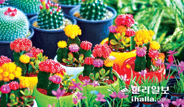 제주오일시장 꽃 코너에는 알록달록 선인장 화분이 주인을 기다리고 있다. 강경민기자
