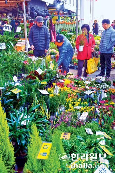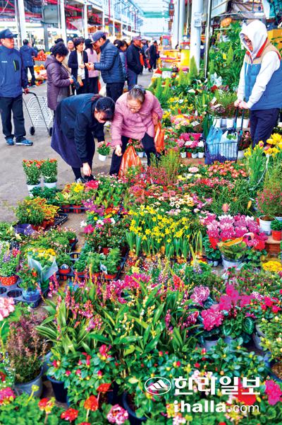 제주오일시장 꽃시장에서 시민들이 봄을 맞아 집안 분위기를 바꿀 꽃화분을 고르고 있다.