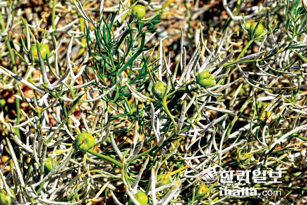 좀 더 가까이 접근하다가 시리아운향풀(Peganum harmala)을 만났다. 꽃은 이미 지고 열매가 거의 성숙단계였다. 학명 중 페가눔은 그리스어 페가논에서 나온 말로서 1세기의 그리스 의사이며 본초학자인 디오스코리데스(Pedanios Dioscorides)가 그의 저서 '의약재료'에 쓴 이름에서 따온 것인데 야생 운향과 유사한 식물을 의미하는 것으로 보인다. 그는 500종 이상의 식물에 대한 정명, 이명, 산지를 기재한 책을 썼는데 중세에 그리스어, 라틴어, 아라비아어로 번역, 널리 사용되었다고 한다.