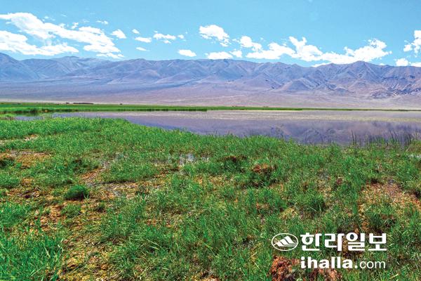건조한 알타이산맥 평야지대에 형성된 습지.
