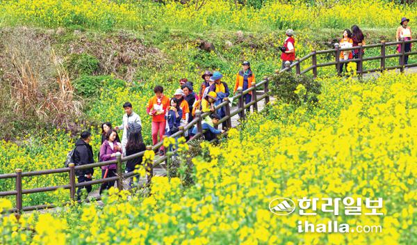 봄이 왔다고 얼굴을 내밀며 아우성인 꽃이 여럿이지만 제주의 봄을 이야기할 때 빼놓을 수 없는 게 유채꽃이다. 3월부터 4월까지 제주 곳곳을 노랗게 물들이는 유채꽃은 꽃말이 '명랑' '쾌활'로, 생동하는 봄을 닮아있다.