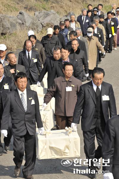 제주국제공항 발굴 유해를 운구하는 모습. 한라일보DB