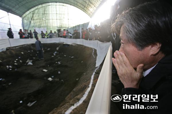 제주국제공항 유해발굴 설명회에서 4·3유족들이 발굴 현장을 보며 눈물을 글썽이고 있다. 한라일보DB
