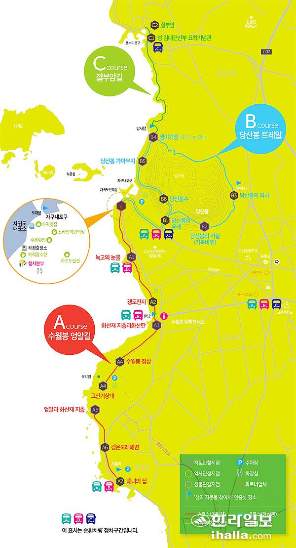 수월봉 트레일 코스는 수월봉 엉알길 A코스, 당산봉 트레일 B코스, 절부암길 C코스가 있다. 각 코스에서 만날 수 있는 명소·명물을 소개한다.