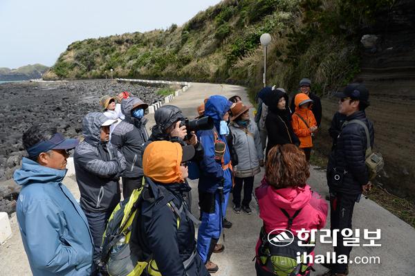 탐방객들은 푸른 바다를 옆에 끼고 해안 절벽을 따라 선명히 모습을 드러낸 화산재 지층을 눈에 담으며 류춘길 박사의 지질학에 대한 내용을 경청했다.