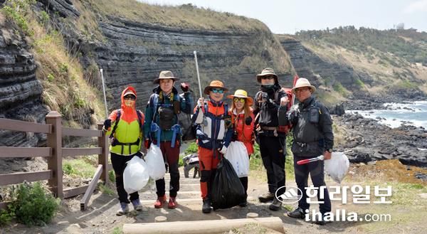 2018 제주도세계지질공원 수월봉 트레일 행사 마지막 날인 8일 제주시 한경면 고산1리 수월봉 일대에서 봉사단체인 '한라산 지킴이' 회원 6명이 환경 정화 활동을 펼쳤다. 강경민기자
