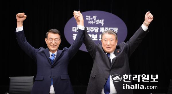 더불어민주당의 제주도지사 선거 김우남 예비후보와 문대림 예비후보가 11일 토론에 앞서 손을 맞잡은 채 사진 촬영에 응하고 있다. 강희만기자