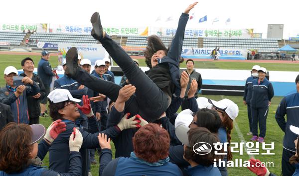 지난해 제주도민체전에서 참가 선수들이 헹가래 치고 있다.