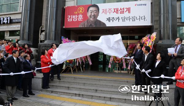 김방훈 자유한국당 제주도지사 선거 예비후보가 15일 제주시 연동에 위치한 선거사무소 앞에서 자유한국당 소속 도의원 예비후보, 지지자들과 함께 현판 제막식을 진행하고 있다. 강희만기자