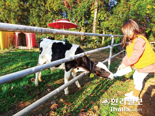 아침미소목장에서 어린송아지에게 우유를 주는 체험을 하고 있다.