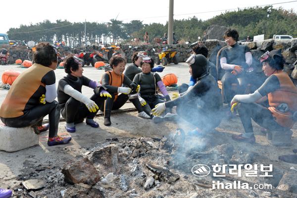 제주시 구좌읍 행원리 해녀들이 물질에 나서기에 앞서 불턱에서 담소를 나누며 겨울 추위를 달래고 있다. 사진=한라일보 DB