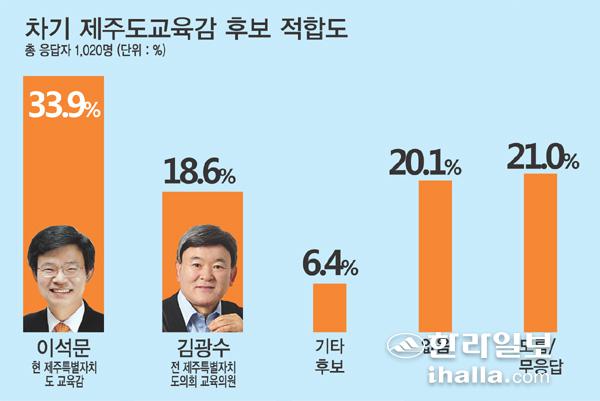 한라일보와 미디어제주·시사제주·제주투데이·헤드라인제주가 (주)리얼미터에 의뢰해 지난 19일부터 20일까지 전화면접으로 도내 거주 19세 이상 성인 남녀 1020명으로 대상으로 여론조사를 실시한 결과 차기 제주도교육감 후보 적합도에서 이석문 교육감이 33.9%로 18.6%를 기록한 김광수 예비후보(전 교육의원)를 오차범위 밖인 15.3%p 앞섰다. 기타 후보는 6.4%, 부동층('없음' 20.1%, '모름/무응답' 21%))은 41.1%였다.