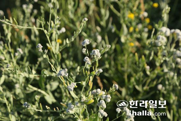 Lepidium latifolium)가 고개를 내밀고 있다. 십자화과 다닥냉이속 식물이다. 학명의 '라티폴리움'이 '잎이 넓은'의 의미를 가지므로 우리나라 이름을 이렇게 붙였다. 간혹 1m 이상 크게 자라기도 하는 식물이지만 여기서는 50㎝ 정도다. 전체적으로 곧추 서서 자라며 가지를 많이 친다. 잎은 가죽질이다. 표면이 반짝이고 질기다. 다소 회색이 돈다. 우리나라에 인접한 중국에도 분포하고, 아프가니스탄, 인도, 카슈미르, 카자흐스탄, 키즈기르스탄, 파키스탄, 러시아, 타지키스탄, 투르크메니스탄, 우즈베키스탄 등 아시아에 널리 분포한다. '한국의 속 식물지'라는 자료에는 이 속 식물로 우리나라에 8종이 자라는 것으로 돼 있다. 몽골에는 7종이 분포한다. 그 중 미륵냉이와 앉은잎다닥냉이 2종이 공통이다.