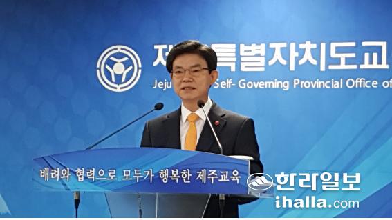 이석문 교육감이 2일 제주도교육청 기자실에서 열린 기자회견에서 6.13 지방선거 교육감 선거 출마를 공식 선언하고 있다. 오은지기자
