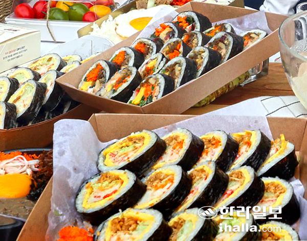 [재료] 쌀 240g, 달걀 4개, 오이 80g, 우엉체 40g, 간장 80g, 물엿 160g, 김 4장, 당근 80g, 김밥용 단무지 80g, 맛소금 2작은술, 참기름 2.5작은술, 깨소금 1작은술, 식용유 2.5작은술.