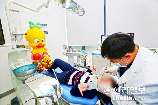 최근들어 소아치과치료에 대한 선호도가 높아지면서 아이들의 치료에 따른 심리적 행동유도와 약물 이용 행동유도, 물리적 행동 유도 등 치과에서 사용하는 행동 유도방법이 주목을 끌고 있다. 제주대학교병원 소아치과 조찬우 교수가 어린이환자를 치료하고 있다. 제주대학교병원 제공