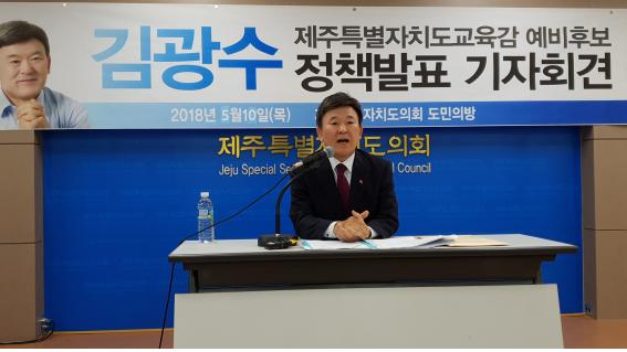 김광수 제주특별자치도교육감 예비후보는 10일 제주도의회 도민의 방에서 기자회견을 갖고 '(가칭)제주특별자치 교육과정 991 프로젝트' 정책을 발표했다.