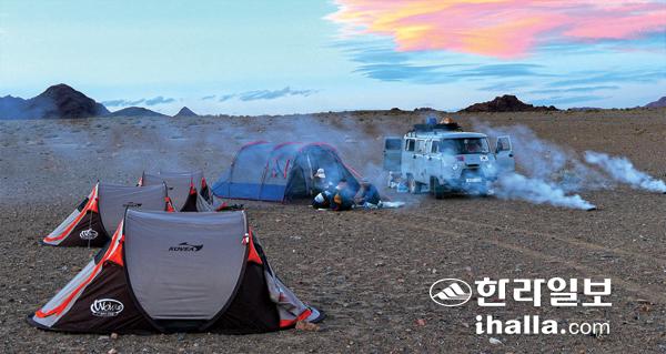 어느 야트막한 봉우리를 병풍삼아 야영지를 택했다. 오늘 우리는 아침 여섯시부터 탐사를 시작했다. 어제는 알타이시에서 50㎞ 정도 떨어진 곳에서 야영을 했었다. 야영지에서 출발하려면 누구랄 것도 없이 대원들은 분주하게 움직인다. 대원마다 맡은 임무를 충실히 수행해 주어야한다. 식사를 준비하고, 텐트를 걷어야하며, 자동차에 짐을 싣고, 주변의 식물을 조사한다. 식사를 마치면 그때서야 출발하게 된다.