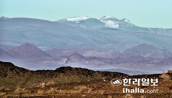 까마득히 멀리 눈 덮인 산이 보인다. 거리는 100㎞는 족할 것이다. 참바가라브산이다. 호브드아이막과 바얀울기아이막의 경계에 있다. 서몽골 알타이산맥의 주봉의 하나다. 이 산은 높은 봉우리 두 개가 있는데 그 중 높은 것이 차스트 오올(Tsast Uul)봉인데 몽골말로 '눈 덮인 산' 즉 설산이라는 뜻이다. 높이는 해발 4196m에 달한다. 다른 하나는 이 산의 이름과 같은 참바가라브봉으로서 해발 4165m이다,