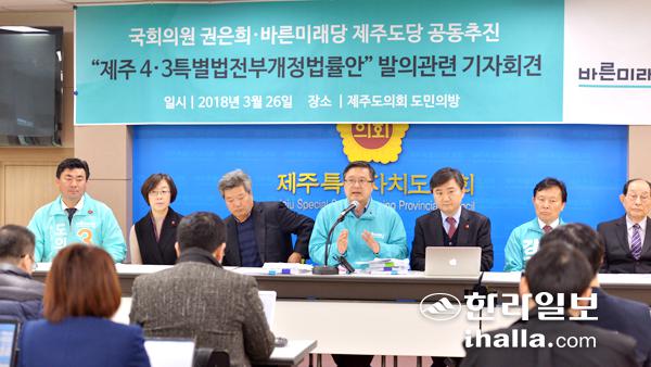 바른미래당 제주도당이 지난 3월 26일 제주도의회 도민의 방에서 제주4·3특별법 전부개정법률안 설명 기자회견을 개최하고 있다.