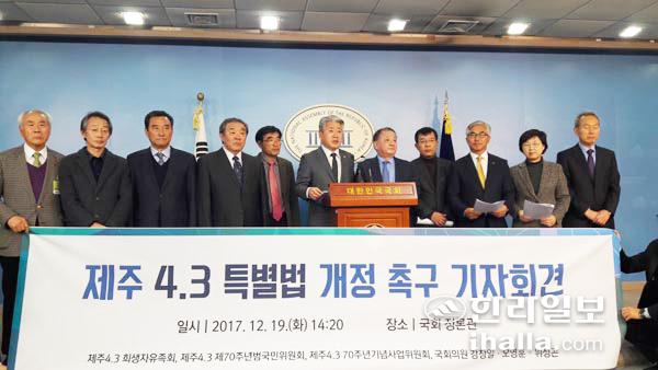 더불어민주당 강창일·오영훈·위성곤 의원과 제주4·3 희생자유족회, 제주4·3 70주년 기념사업위원회, 제주4·3 제70주년범국민위원회는 지난해 12월 19일 국회에서 제주4·3 특별법 전면개정안의 조속한 국회 처리 촉구기자회견을 가졌다. 사진=한라일보 DB
