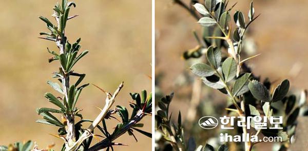 관목들은 대부분 골담초에 속하는 종류들인데 그 중 가장 많은 것이 은골담초다. 그 사이사이에 흰껍질골담초(카라가나 루코플로에아, Caragana leucophloea)가 섞여 있다. 은골담초는 잎의 표면에 은색의 털이 덮여 있어서 은빛으로 반짝인다. 반면 이 종은 나무껍질이 하얀색이다. 그 외에도 이 종은 잎의 배열 상태가 아주 다르기 때문에 쉽게 구분된다.