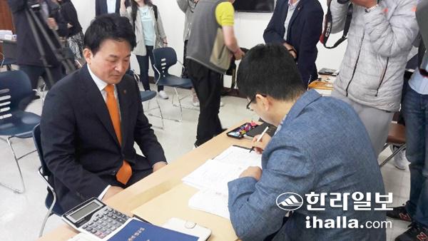 원희룡 제주자치도지사 예비후보가 6.13지방선거 후보등록 첫날인 24일 등록하고 있다. 강희만기자