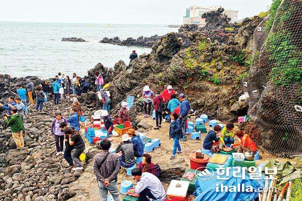 5월 24일 현재의 용두암 전경. 탑동 매립공사 이후 생긴 호텔이 용머리 뒤로 보인다.