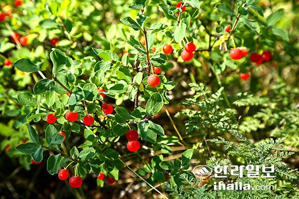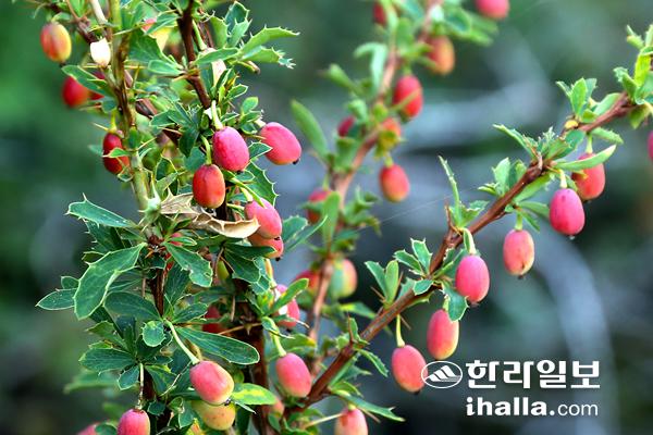 바위지대를 조사하다 빨간 열매가 달린 작은 나무들을 만났다. 한 눈에 봐도 한라산 특산종인 섬매발톱나무와 닮았다. 시베리아매자나무(베르베리스 시비리카)다. 국명은 학명의 의미를 살려 이렇게 붙였다. 우리나라엔 특산종인 매자나무가 강원, 경기, 충북지방에 자라고, 당매자나무라는 식물이 평안북도의 고산에 자란다. 그리고 중국의 북부, 러시아의 시베리아, 일본의 고산에도 분포하는 것으로 알려진 매발톱나무가 한반도의 높은 산에 분포하는데 그의 변종인 섬매발톱나무가 한라산 특산종으로서 고지대에 자라고 있는 것이다.