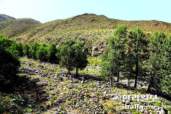 하르하이라아산 계곡에 포플러 숲이 넓게 펼쳐져 있다.