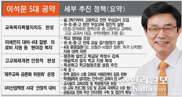 "다시는 경쟁과 서열의 과거로 돌아가지 않겠다"는 이 후보의 5대 중점 공약(중앙선거관리위원회 제출)은 ▷교육복지특별자치도 완성 ▷미세먼지 대비·4대 질병 의료비 지원 등 '현미경 복지' ▷고교체제개편 안정적 완성 ▷'제주교육 공론화 위원회' 운영 ▷'4차 산업혁명 시대' 안정적 대비 등이다.