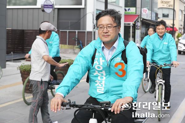 바른미래당 장성철 제주도지사 선거 후보는 법정 선거운동 첫날인 31일 오후 5시부터 제주시 칠성로에서 '촘촘한 골목 자전거 유세'를 전개했다. 이번 유세는 세몰이식 출정식보다는 후보가 직접 도민 삶의 현장을 직접 찾아가 인사하고 출마 이유와 정책을 설명한다는 취지에서 이뤄진 것이다.