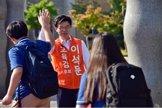 이석문 후보는 이날 오전 7시 30분부터 남녕고와 노형중에서 '아이들과 하이파이브'를 이어갔다.