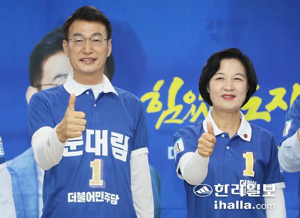 4일 오전 제주시 노형동 문대림 제주도지사 후보 선거사무소에서 열린 더불어민주당 중앙선거대책위원회 회의에서 추미애 대표와 문대림 후보가 포즈를 취하고 있다. 연합뉴스