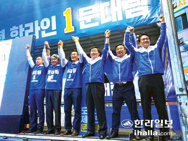더불어민주당 문대림 제주도지사 후보가 지난 4일 중앙당선대위 및 지도부 등과 함께 집중유세에 나서 도민들에게 지지를 호소하고 있다. 문대림 선거캠프 제공