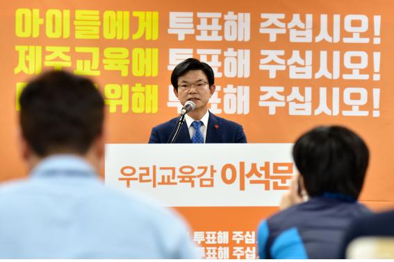 6.13 지방선거를 이틀 앞둔 11일 이석문 제주특별자치도교육감 후보가 제주도민의 방에서 기자회견을 갖고 "아이들에게, 제주교육에, 미래를 위해 투표해 달라"고 도민들에게 호소했다.