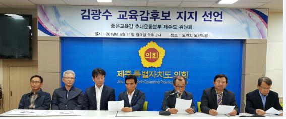좋은 교육감 추대 국민운동본부 제주도위원회는 11일 제주도의회 도민의 방에서 기자회견을 갖고 "우리는 전교조 출신이 아닌 교육감을 원한다"며 6.13지방선거 교육감 선거에서 김광후 후보 지지를 공개 선언했다. 오은지기자