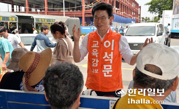 이석문 제주도교육감 당선인이 선거운동중인 지난 2일 제주시 민속오일시장에서 유권자들과 이야기를 나누고 있다. 강희만기자