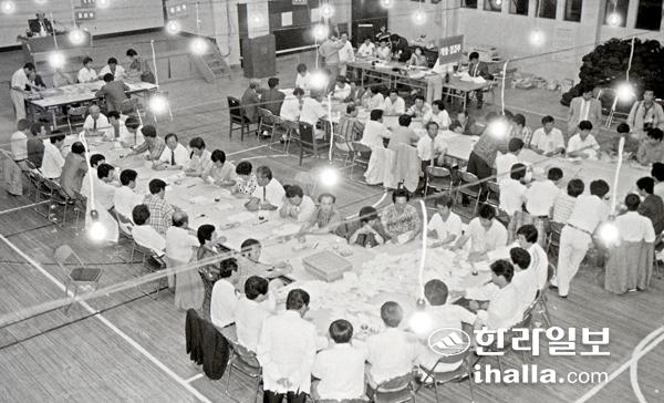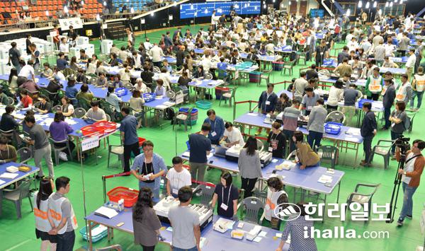 제7회 전국동시지방선거 개표작업이 진행된 지난 13일 제주시 한라체육관에서 선거관리위원회 관계자들과 개표참관인들이 개표 상황을 지켜보고있다. 강희만 기자 photo@ihalla.com