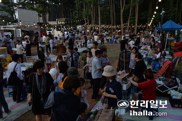 지난 1일 제주시 수목원 테마파크에 개장한 '수목원 길 야시장'에 많은 시민과 관광객들이 찾아 다양한 음식과 체험을 하며 즐거운 시간을 보내고 있다. 강희만기자