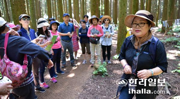 24일 사려니숲에서 김성란 서양화가가 전문가와 함께하는 숲길 탐방을 진행하고 있다. 강희만기자