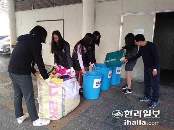 교내 쓰레기 중 재활용품을 분리하고 있는 화홍중 이형우 교사와 학생들.