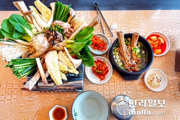 홍장식 사장에게 주메뉴인 해신탕을 부탁했다. 그러자 테이블에는 보기에도 푸짐한 두툼한 소갈비와 삶은 닭이 김이 모락모락 난 상태로 냄비에 담겨져 있었다. 또 싱싱한 해산물과 배추, 부추, 팽이·새송이버섯, 청경채 등 신선한 채소도 담겨져 있었다. 밑반찬은 콩나물무침과 김치, 깍두기, 샐러드 등 해신탕과 곁들이기 좋은 것으로 이뤄졌다.