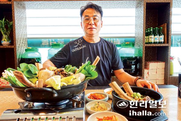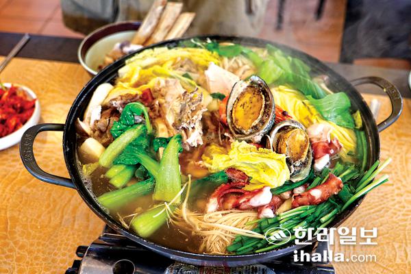 제주시 아라2동에 위치한 '육(肉)갑봉'에서는 갈비와 닭, 전복, 낙지, 게, 새우와 함께 신선한 채소를 곁들여 먹는 '해신탕'을 만나볼 수 있다. 주변에 대형 아파트 단지와 주택가가 밀집돼 있어 점심이나 저녁시간대 손님들로 북적이고 있는 곳이다.