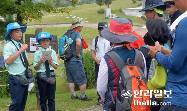 함덕초 선인분교 3~6학년 어린이 18명이 28일 거문오름 국제트레킹 개막식에서 해설사양성교육 프로그램을 수료하며 현장에 첫 투입돼 활약하고 있다. 강희만기자