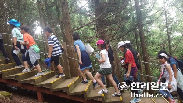 제주어린이 9명과 아오모리 어린이 10명이 31일 어린이 미술교류 프로그램으로 '2018 세계자연유산 거문오름 국제트레킹'행사에 참가해 어린이해설사의 안내로 오름을 오르고 있다. 이현숙기자